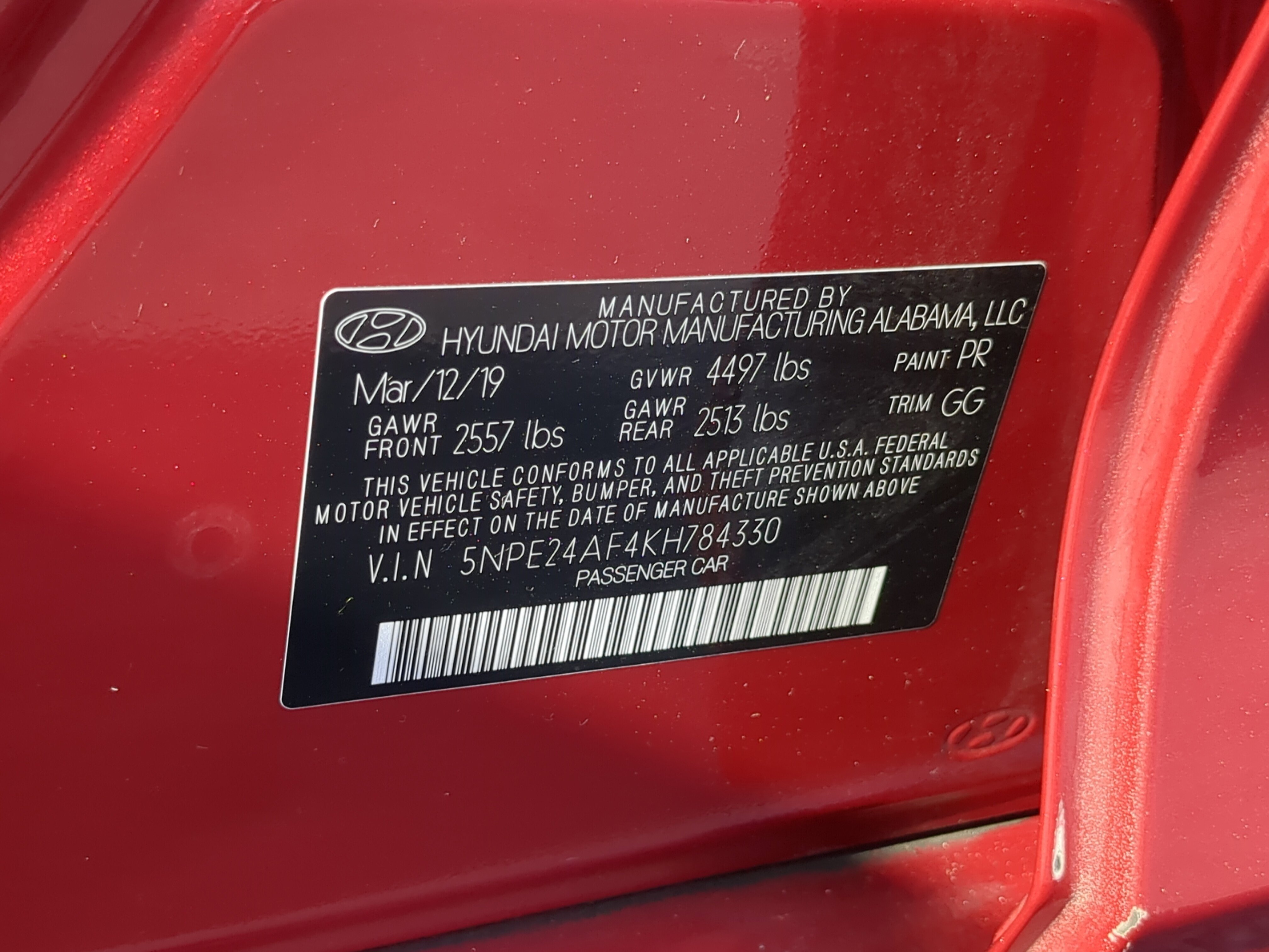 • VIN # 5NPE24AF4KH784330