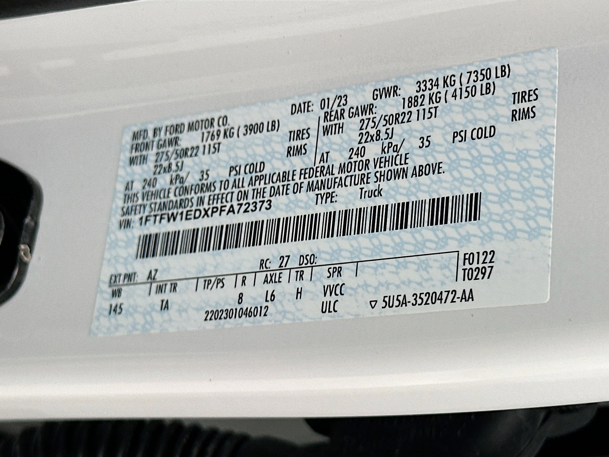• VIN # 1FTFW1EDXPFA72373