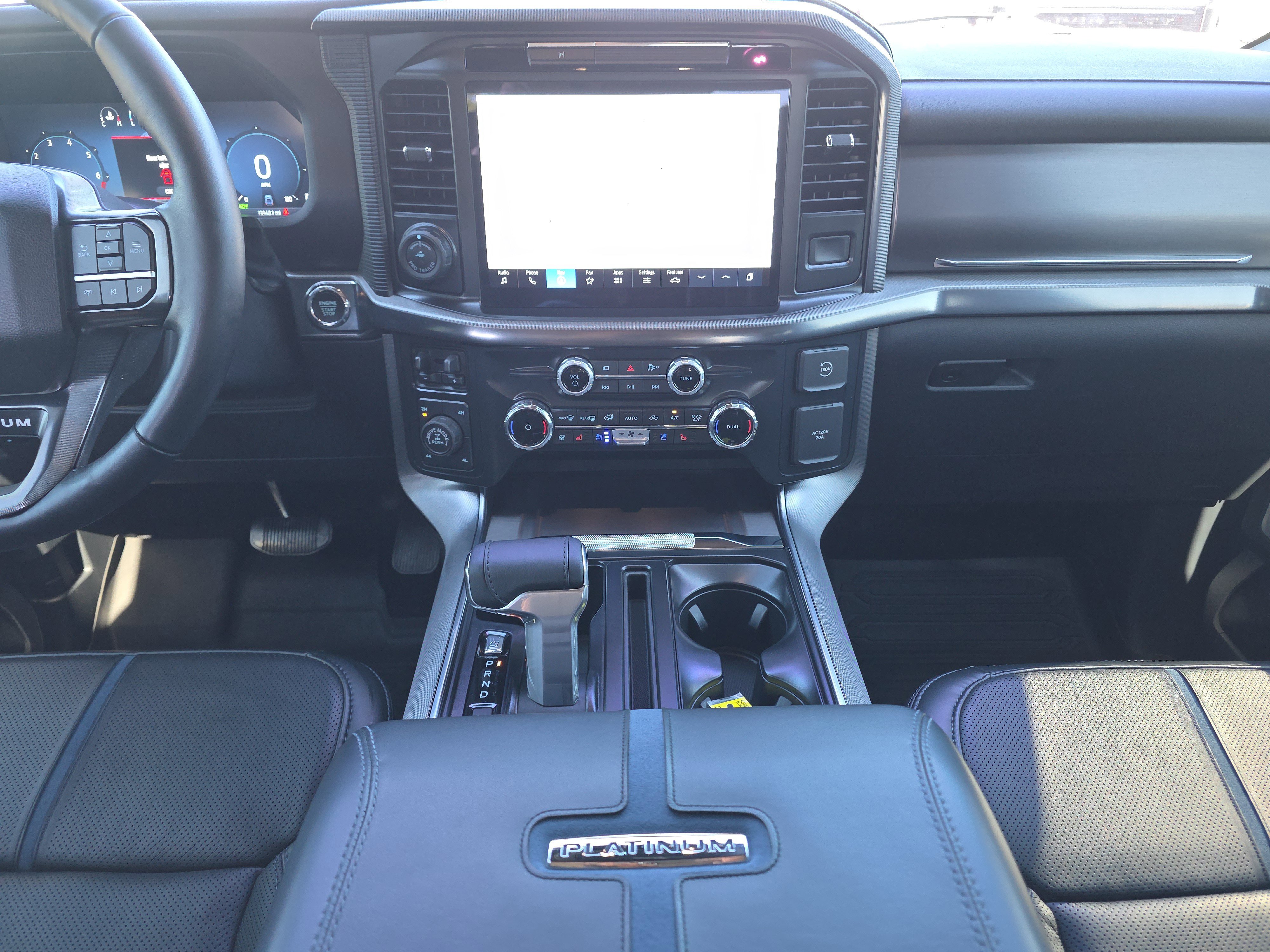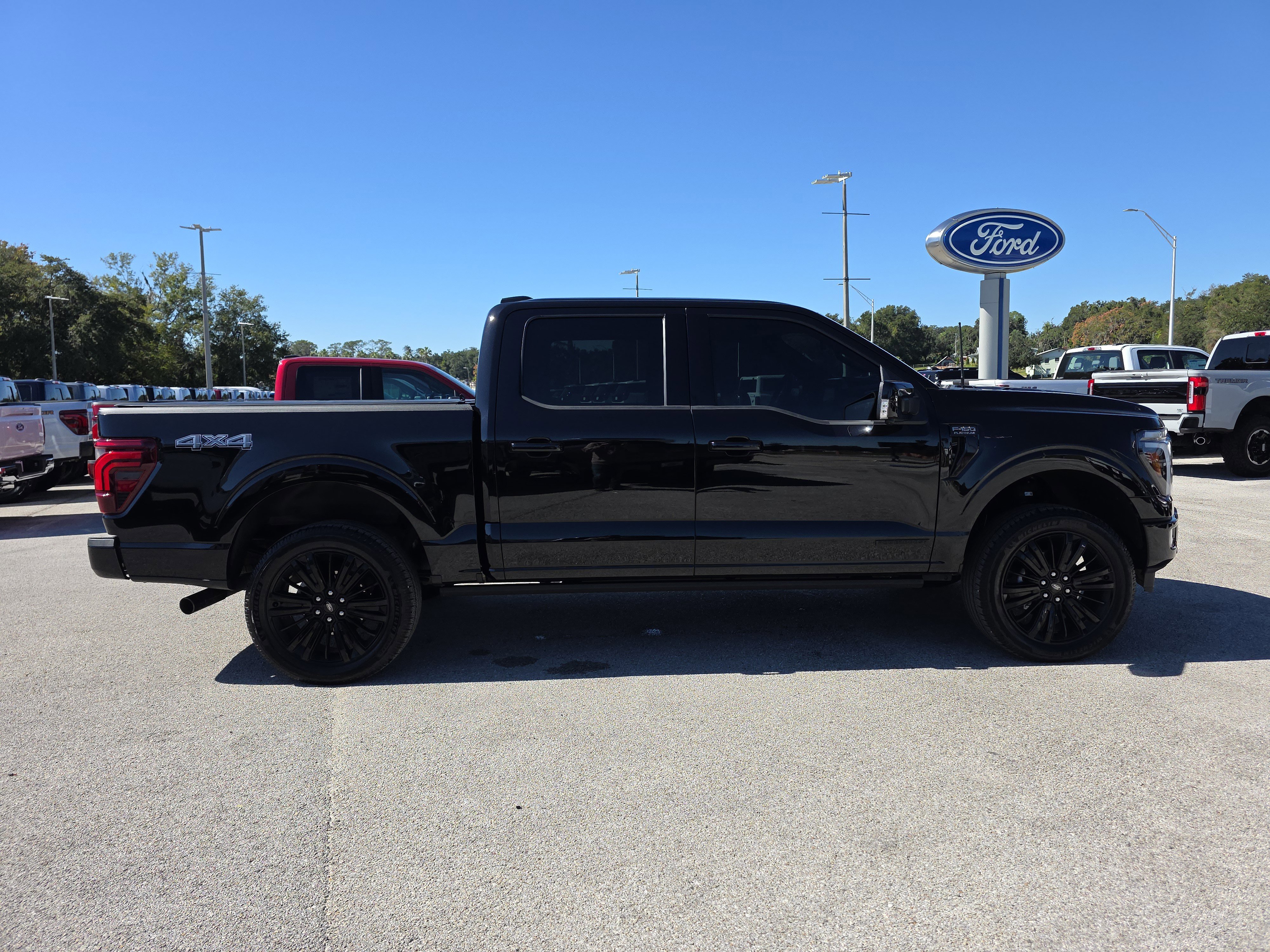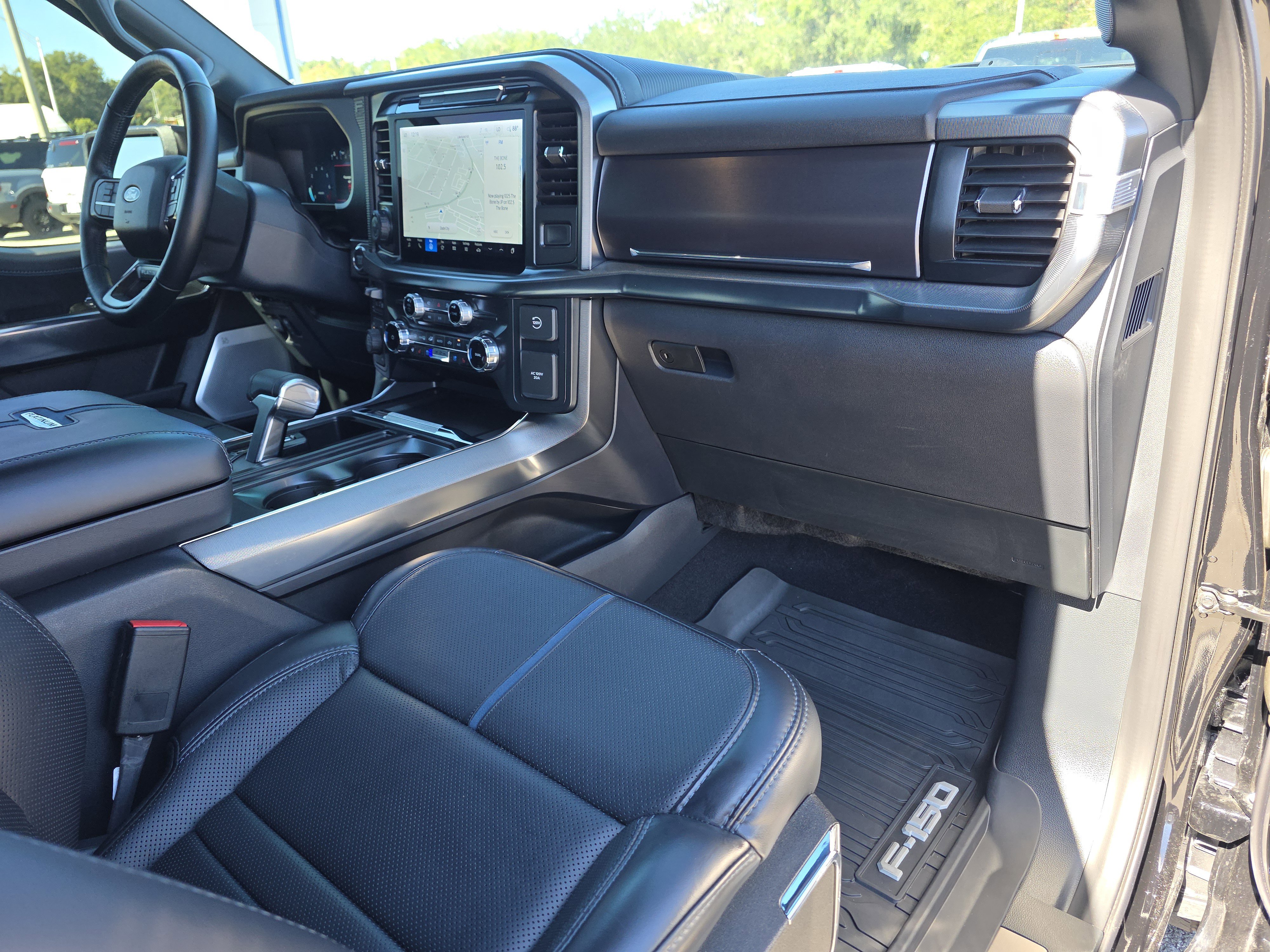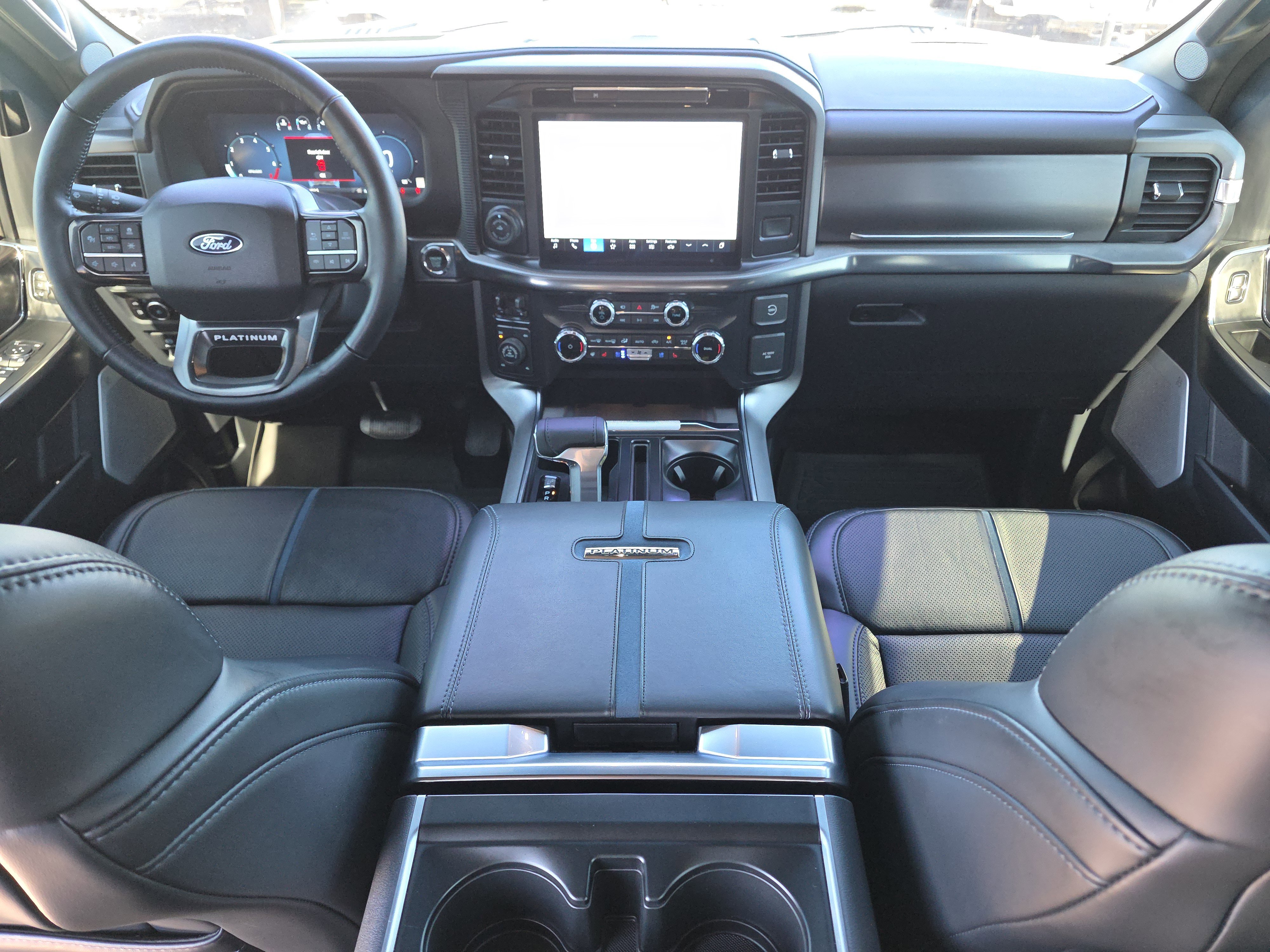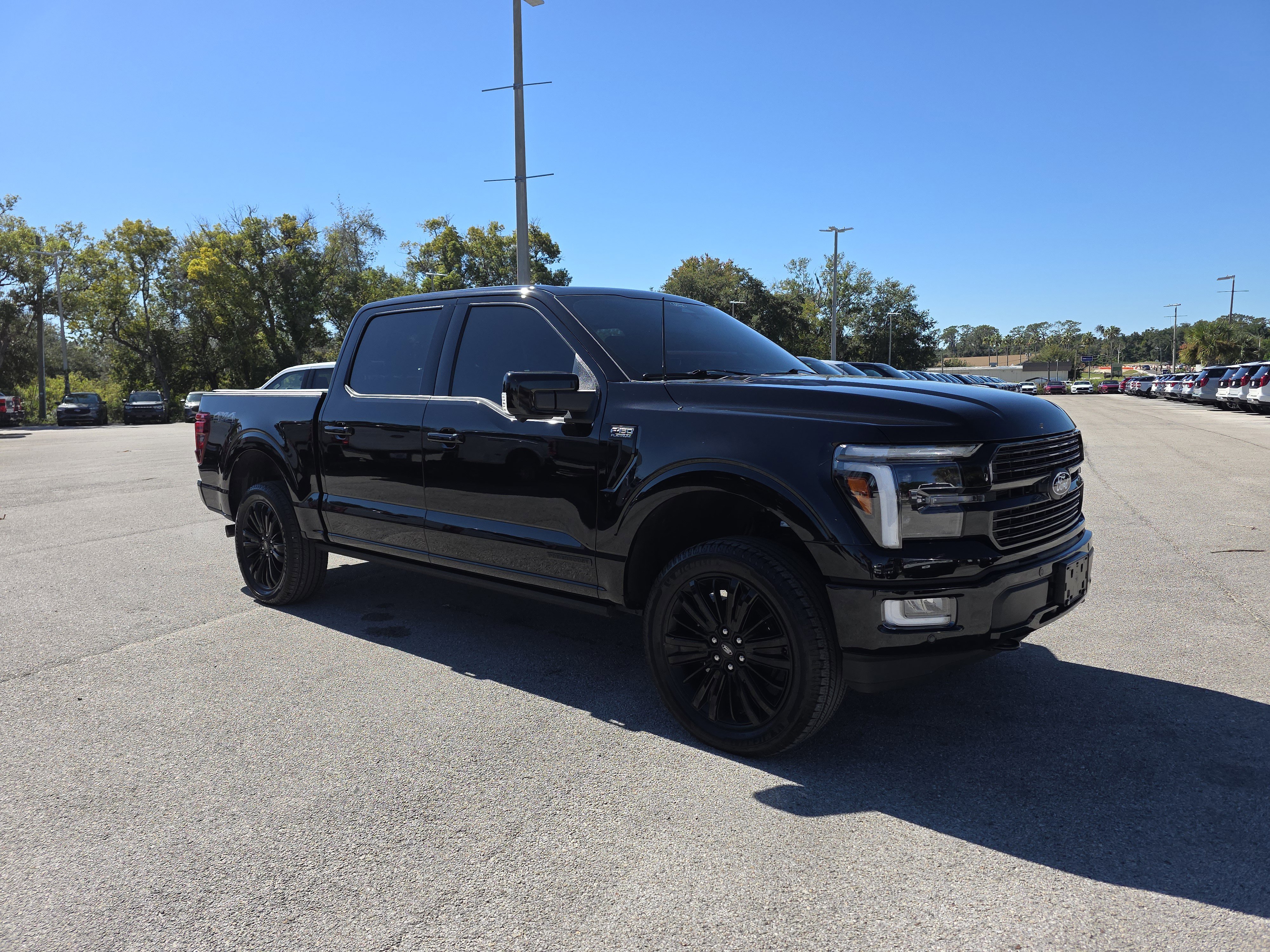 Certified. Black Metallic 2025 Ford F-150 Platinum 4WD 10-Speed Automatic 3.5L PowerBoost Full-Hybrid V6 ALLOY WHEELS, BACK UP CAMERA, BEST PRICE, BEST SELECTION!, BLUETOOTH, 3.5L PowerBoost Full-Hybrid V6, 4WD, 4-Wheel Disc Brakes, 8 Speakers, ABS brakes, Active Cruise Control, Adjustable pedals, Air Conditioning, AM/FM radio: SiriusXM with 360L, Auto High-beam Headlights, Auto tilt-away steering wheel, Auto-dimming door mirrors, Auto-dimming Rear-View mirror, Automatic temperature control, Brake assist, Bumpers: body-color, Compass, Delay-off headlights, Driver door bin, Driver vanity mirror, Dual front impact airbags, Dual front side impact airbags, Electronic Locking w/3.55 Axle Ratio, Electronic Stability Control, Emergency communication system: SYNC 4 911 Assist, Equipment Group 702A High, Front anti-roll bar, Front Bucket Seats, Front Center Armrest, Front dual zone A/C, Front fog lights, Front reading lights, Front wheel independent suspension, Fully automatic headlights, Garage door transmitter, Heads-Up Display, Heated door mirrors, Heated front seats, Heated rear seats, Heated steering wheel, Illuminated entry, Leather steering wheel, Low tire pressure warning, Memory seat, Navigation system: Connected Navigation, Occupant sensing airbag, Outside temperature display, Overhead airbag, Overhead console, Panic alarm, Passenger door bin, Passenger vanity mirror, Pedal memory, Power door mirrors, Power driver seat, Power passenger seat, Power steering, Power windows, Radio data system, Radio: B&O Sound System by Bang & Olufsen, Radio: B&O Unleashed Sound System by Bang & Olufsen, Rain sensing wipers, Rear reading lights, Rear seat center armrest, Rear step bumper, Rear window defroster, Remote keyless entry, Security system, Speed control, Split folding rear seat, Steering wheel memory, Steering wheel mounted audio controls, SYNC 4 w/Enhanced Voice Recognition, Tachometer, Telescoping steering wheel, Tilt steering wheel, Traction control, Trip computer, Turn signal indicator mirrors, Twin Panel Moonroof, Unique Multi-Contour Leather Bucket Seats, Variably intermittent wipers, Ventilated front seats, Voltmeter, Wheels: 22 Gloss Black w/Inserts.